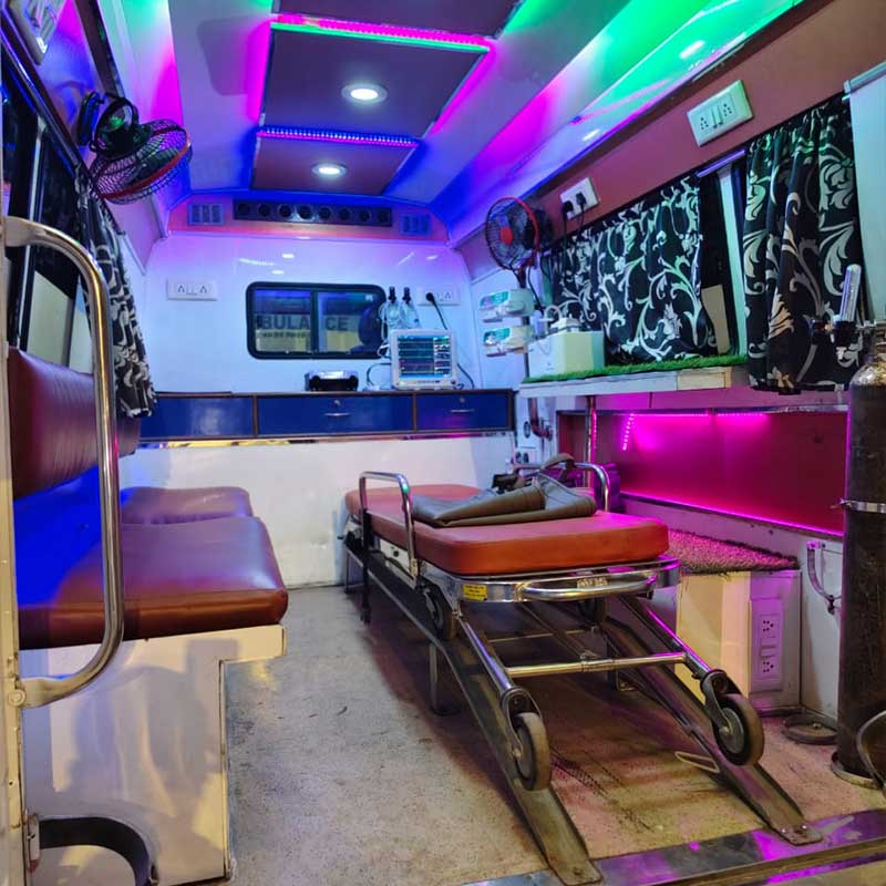 Fully equipped ICU ambulance with trained medical staff for safe and continuous critical patient care during transit.