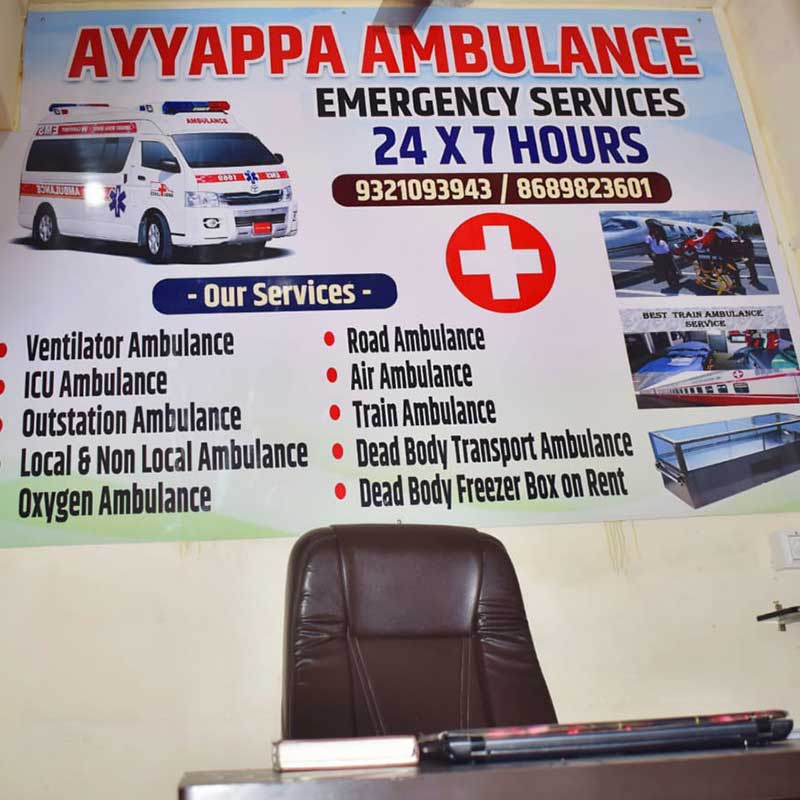 We offer a wide range of services including Ventilator, ICU, Oxygen, Road, Air, and Train Ambulance, along with Local & Non-Local and Outstation Ambulance services for safe long-distance transfers. We also provide Dead Body Transport Ambulance and Dead Body Freezer Box on Rent, handling every situation with dignity and professionalism. Equipped with modern medical facilities and trained paramedics, Ayyappa Ambulance ensures quick dispatch, affordable pricing, and compassionate service in every emergency.
